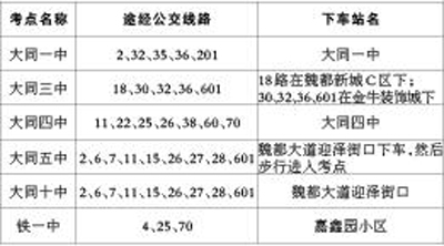 據(jù)市公交公司運(yùn)調(diào)處負(fù)責(zé)人介紹,市區(qū)范圍內(nèi)參加“愛心送考”的公交車共有382臺,線路涉及21條。其中,大同一中、大同四中兩個(gè)考點(diǎn)的下車站名就是學(xué)校本名。大同三中考點(diǎn)的下車站名根據(jù)所乘線路不同有兩個(gè)。乘坐18路的考生和家長,在魏都新城C區(qū)下車;乘坐30路、32路、36路、601路的考生和家長,在金牛裝飾城下車,步行一段進(jìn)入考點(diǎn)。大同五中考點(diǎn)因局部道路封閉,只能在魏都大道迎澤街口下車,然后步行進(jìn)入。大同十中考點(diǎn)的下車站名為魏都大道迎澤街口。鐵一中考點(diǎn)的下車站名為嘉鑫園小區(qū)。